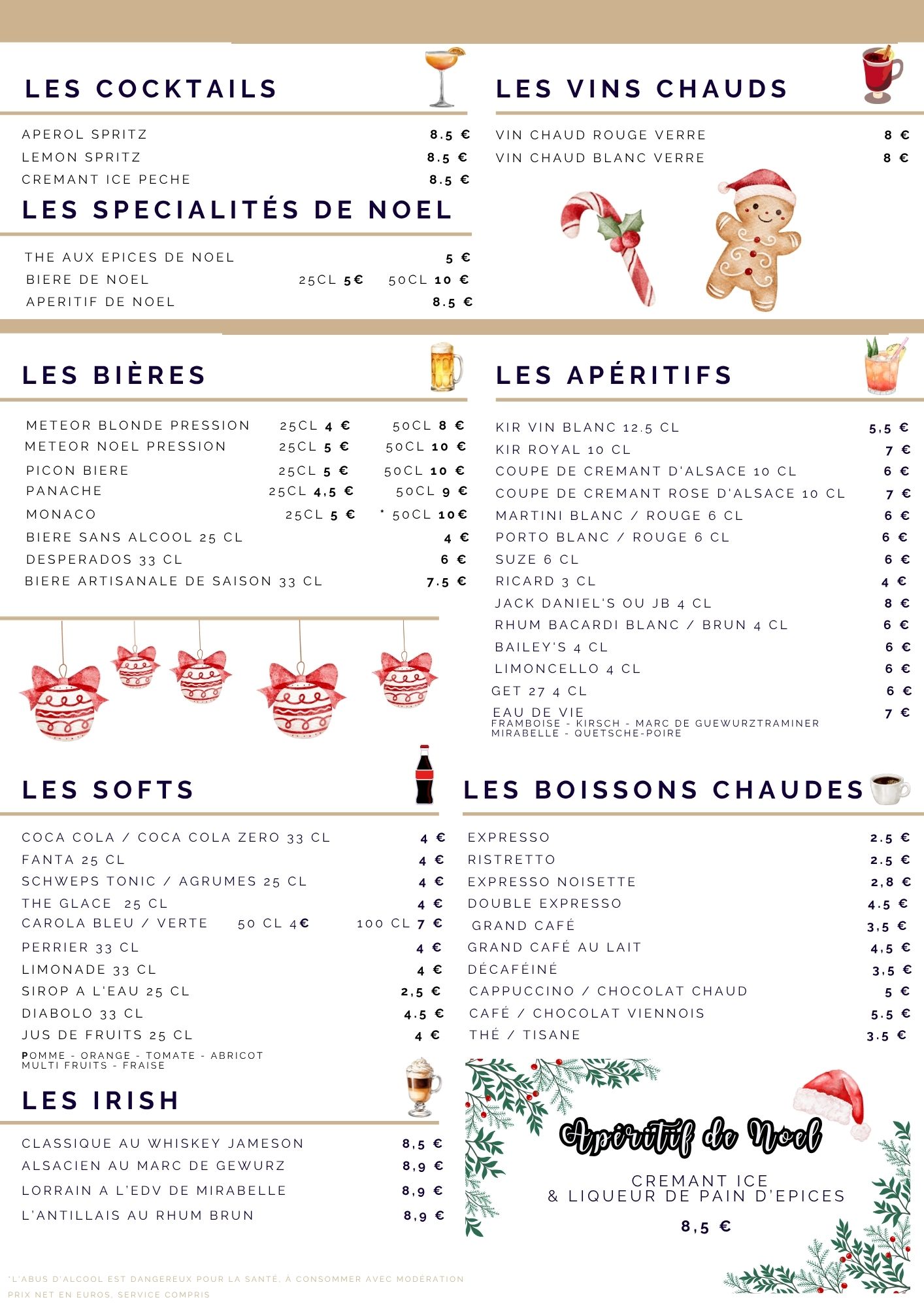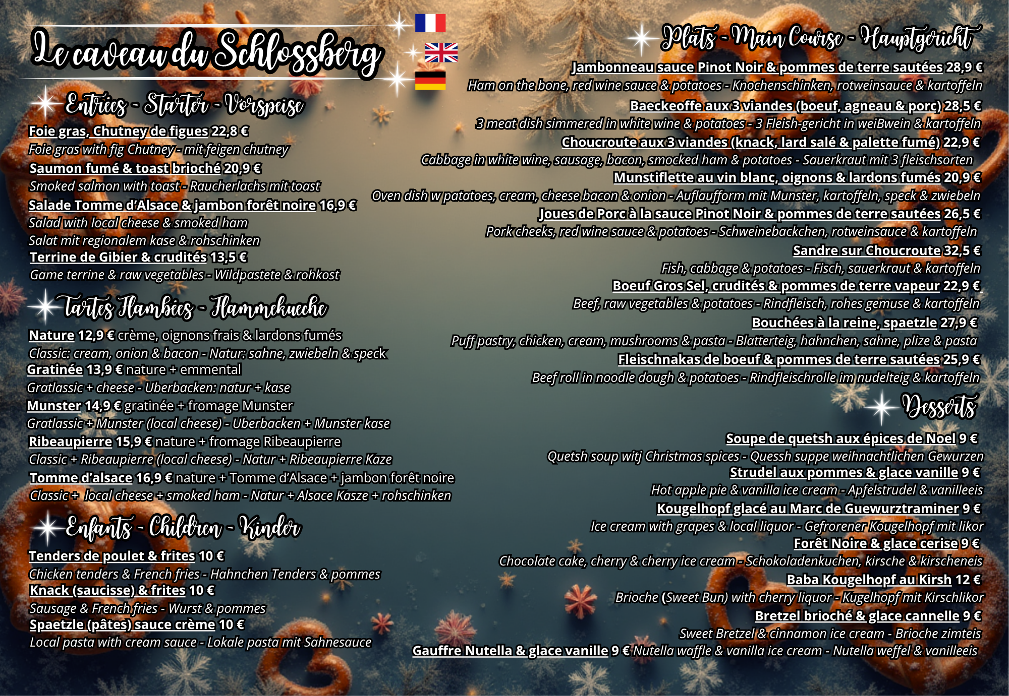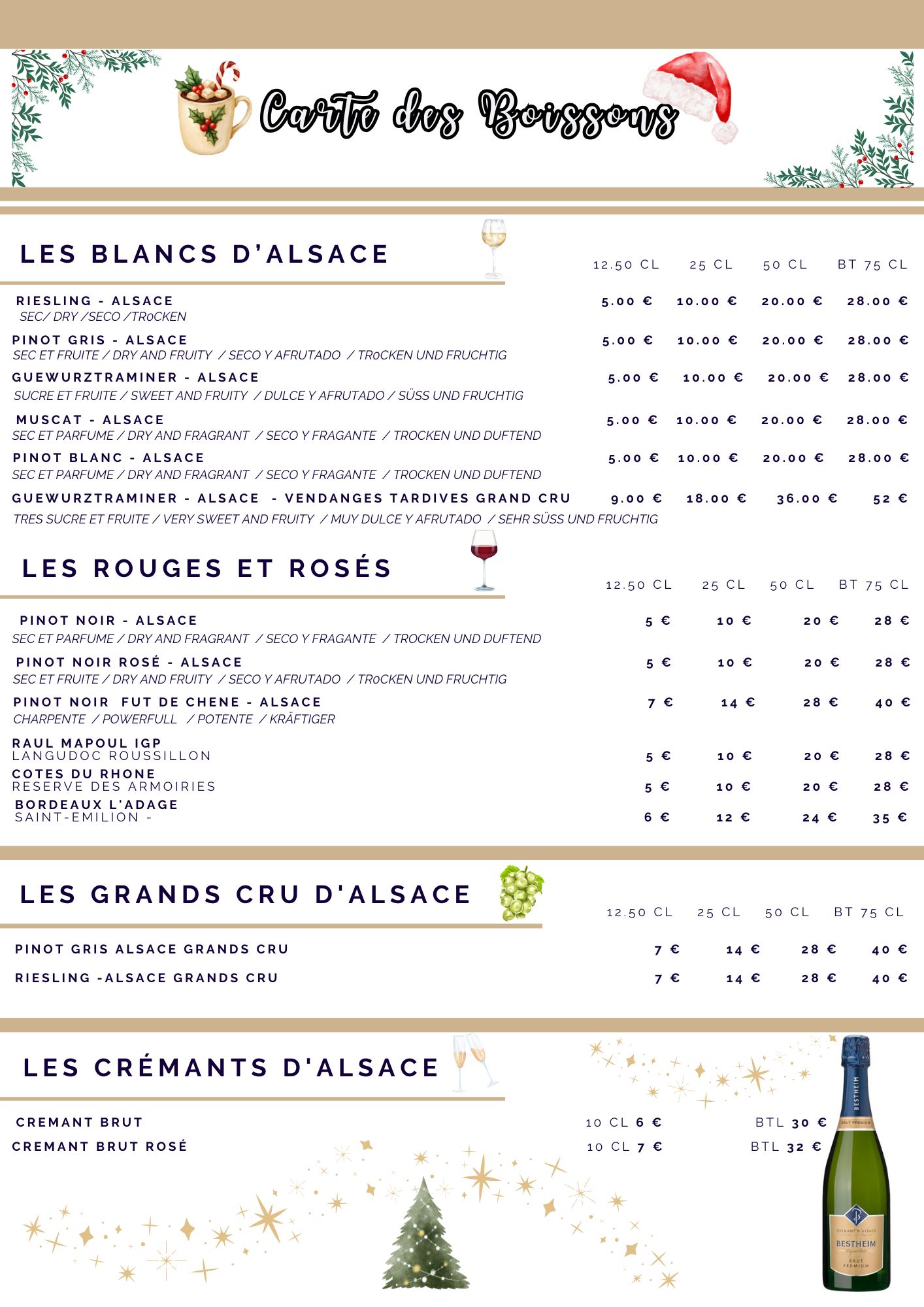 Notre carte met à l'honneur la gastronomie et le terroir local tel que le Baeckeofe, la Choucroute, les Fleischnakas et autres tartes flambées.